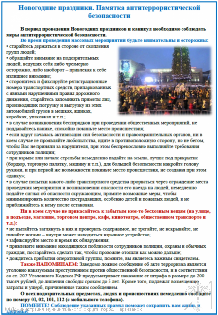 pamyatka.docx Скачать файл. 16.55 КБ pamyatka.docx 8 просмотров Перекрёстные ссылки книги для 23.12.2025г. Памятка «Антитеррористическая безопасность в новогодние и рождественские праздники» ‹ Заседание антитеррористической комиссии № 4 Вверх 09.12.2025г .Заседание антитеррористической комиссии № 4. ›